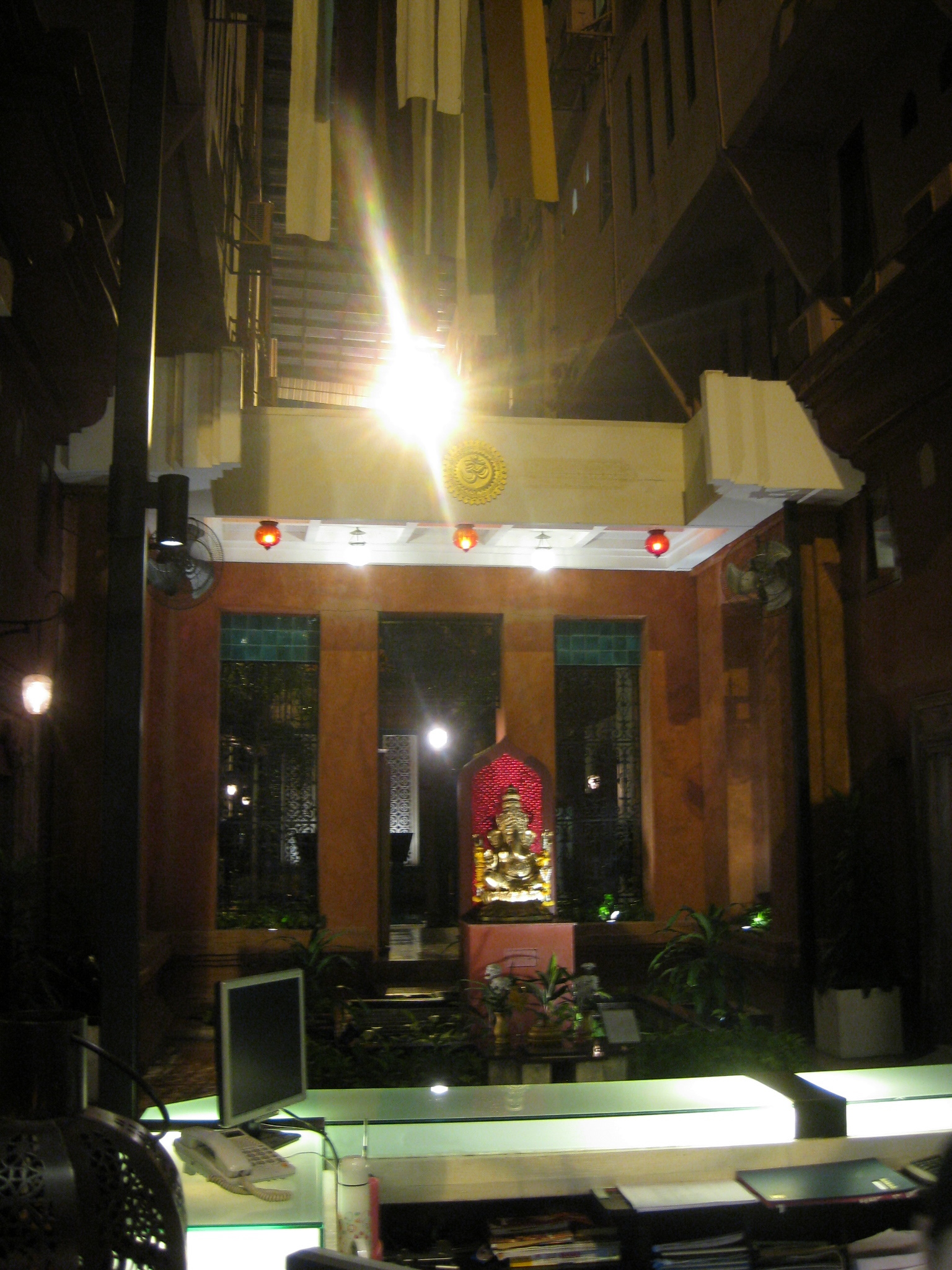 After checking in we walked over to the vintage elevators. The walls on the main floor and up on our floor were painted plaster, lending something like an exotic Middle Eastern feeling to it, in a way. That was my impression. Our room was moderately spacious with a nice TV and fridge. You’d think there’s no value to watching TV in a language you can’t read or speak, but in Thailand that rule doesn’t apply: their commercials are eye-arresting and cute or wry and surreal. Quite a few degrees beyond watching Tom and Jerry in a ramshackle puddle-jumper airport.