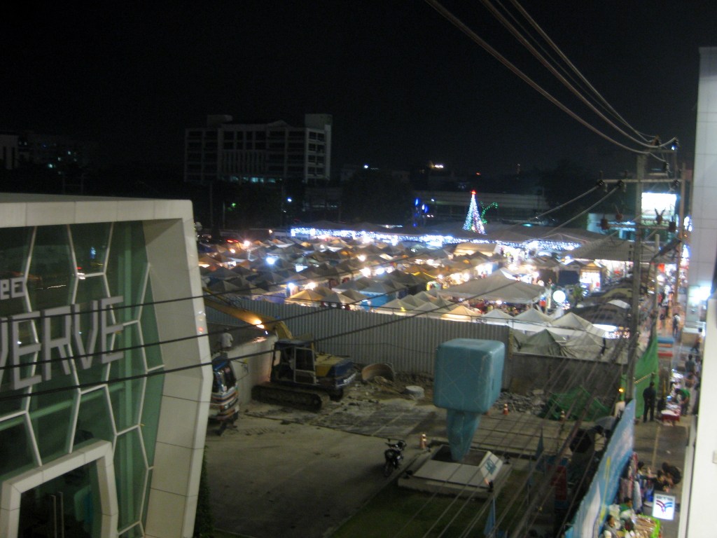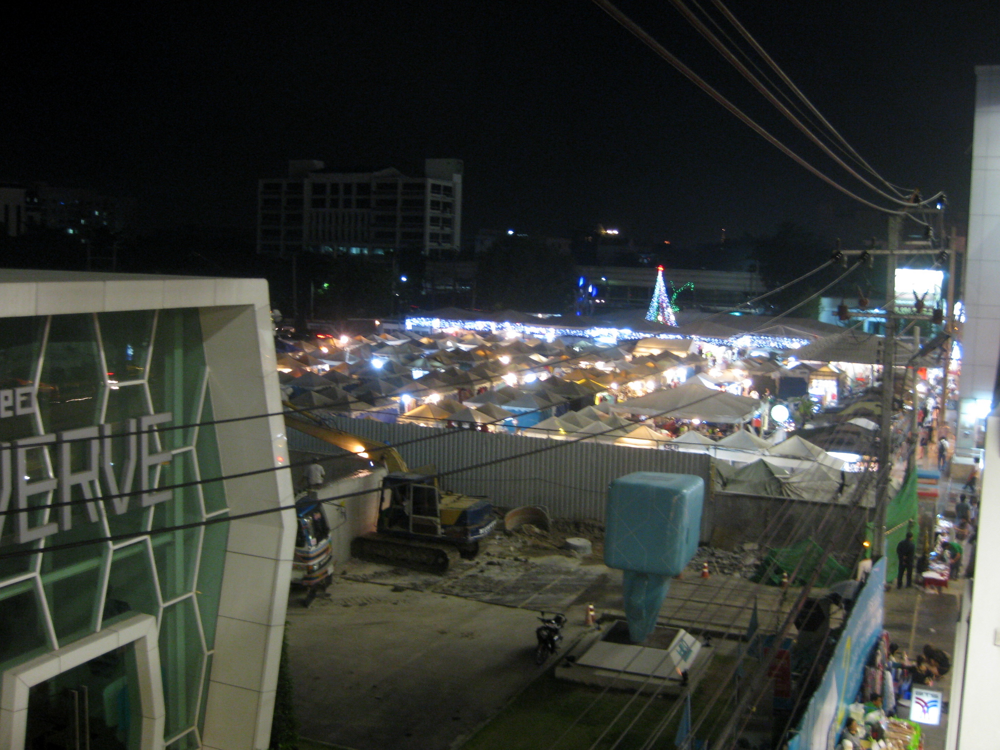 Tired though we were, we didn’t collapse on the bed and lose the entire night. We went right back out on the street, leaving our keys at the front desk, and hit Sukhumvit to see where the action was. Right away we were met with a small metal cart and some plastic lawn furniture: they were cooking chicken for anyone walking around that late at night. Heading in a northwesterly direction, we crossed the street and entered a parking lot filled with temporary tents, the kind that are large enough for an adult to stand in. What would that be, a pergola? From the outside it looked like a lawn-and-garden store, not that I saw any plants but just the two or three rows of outdoor tents reminded me of something like a plant nursery. I figured we’d figure it out tomorrow.