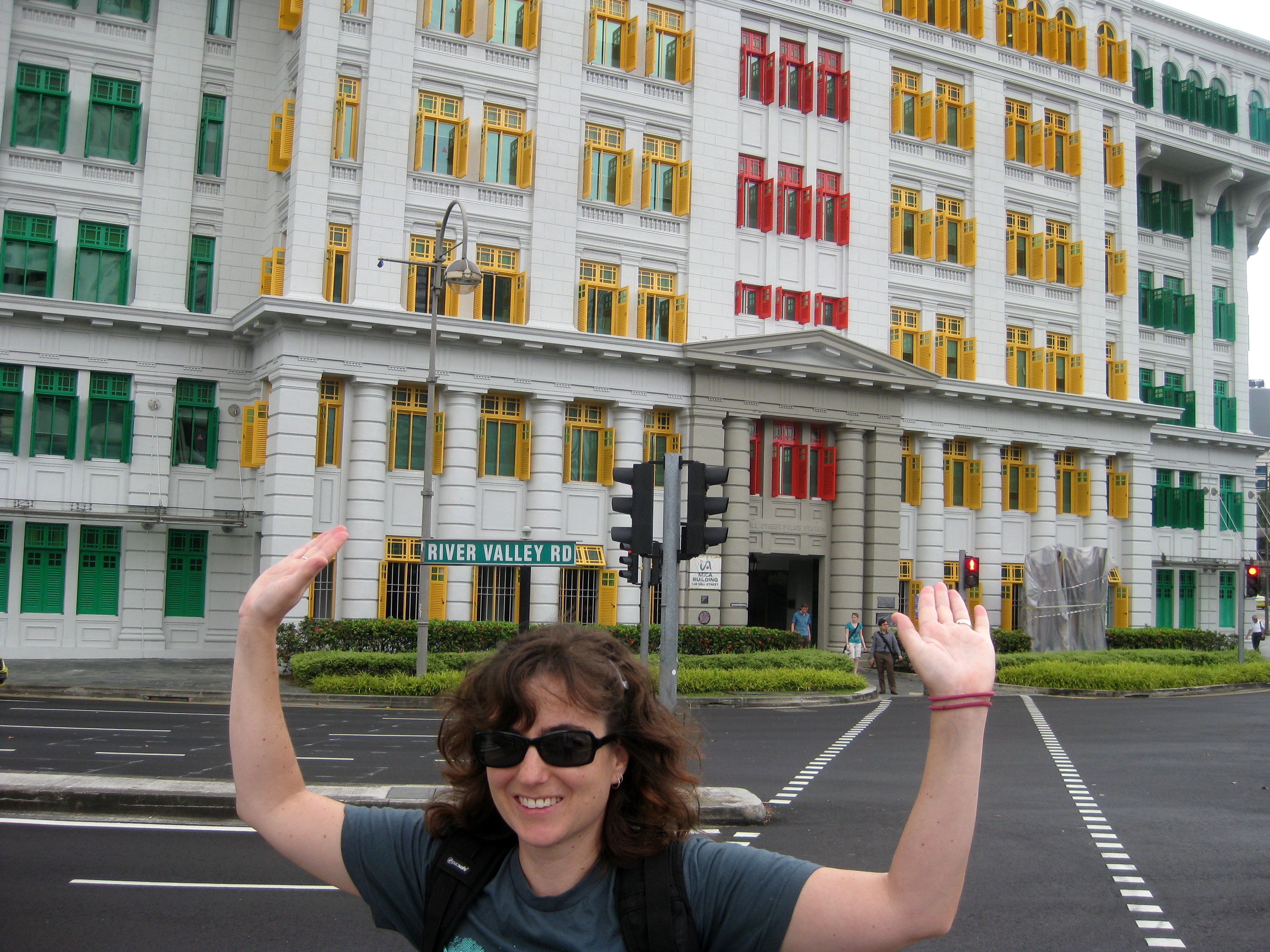 That done, we decided to explore the city without guidance once more. We crossed the Singapore River and meandered by the ominously named Ministry of Culture, Community and Youth. I thought the buildings were pleasantly Scand-looking, actually, especially on this light gray, overcast day. It always looked like it was about to rain, and it was a little chilly, but it never went all the way over into bad weather. This building brightened things up considerably, however.